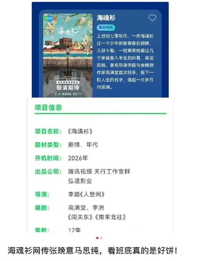 网传《海魂衫》的编剧是热播剧《南来北往》的编剧高满堂,导演是《人世间》的导演李路,如果男女主真的是张晚意和马思纯,那这部剧不说别的,光是班底就很棒。